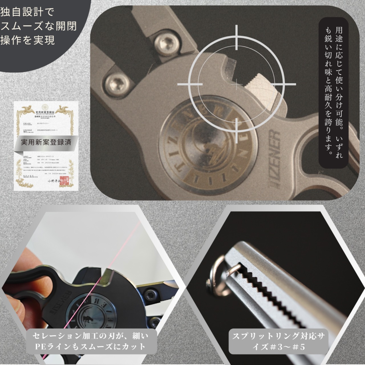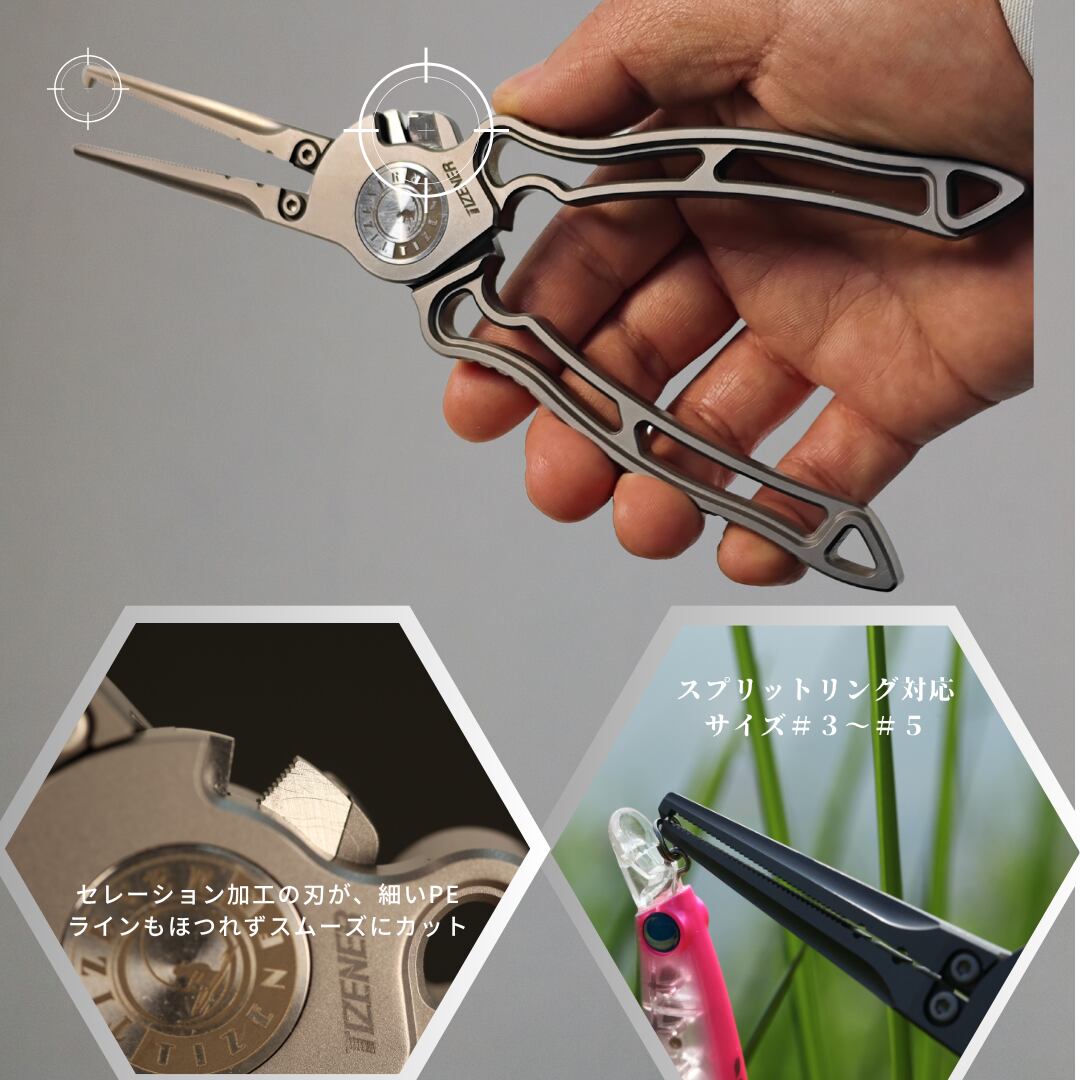 材質:本体 T21チタニウム、ネジ チタン、中央リング 304ステンレス、ラインカッター(タングステン / スウェーデン鋼)
