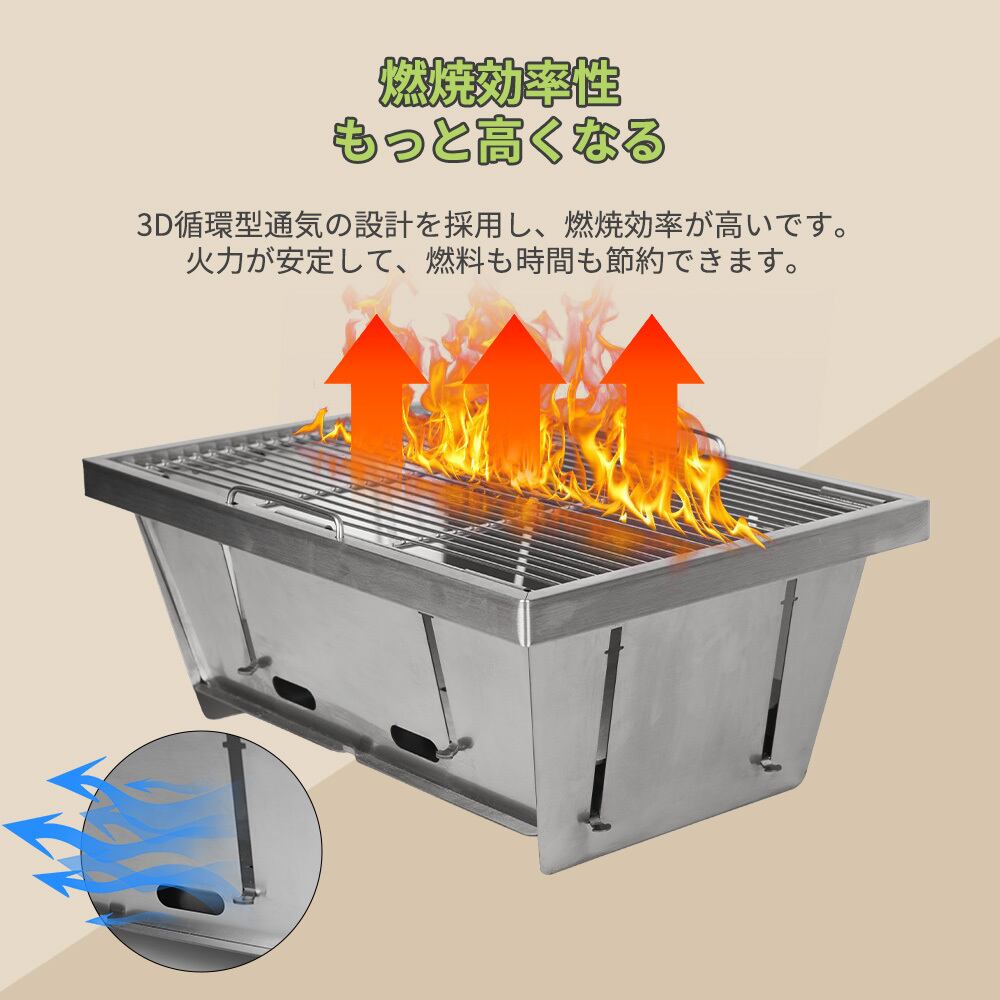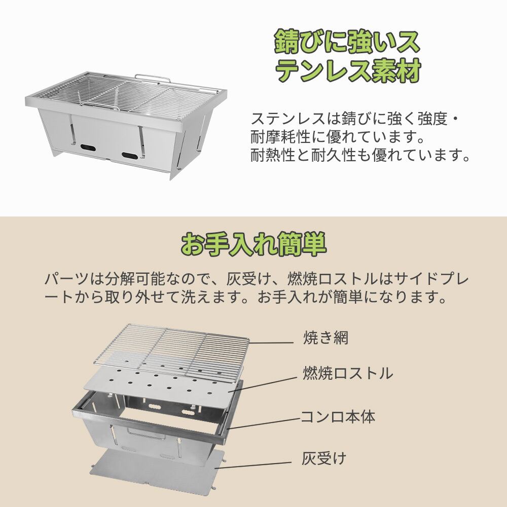 【お手入れ簡単】サビに強いステンレス製で作られ、パーツも分解可能なので、使用後、灰受け、燃焼ロストルはサイドプレートから取り外せ、水洗いして乾かすだけでお手入れが簡単になります。